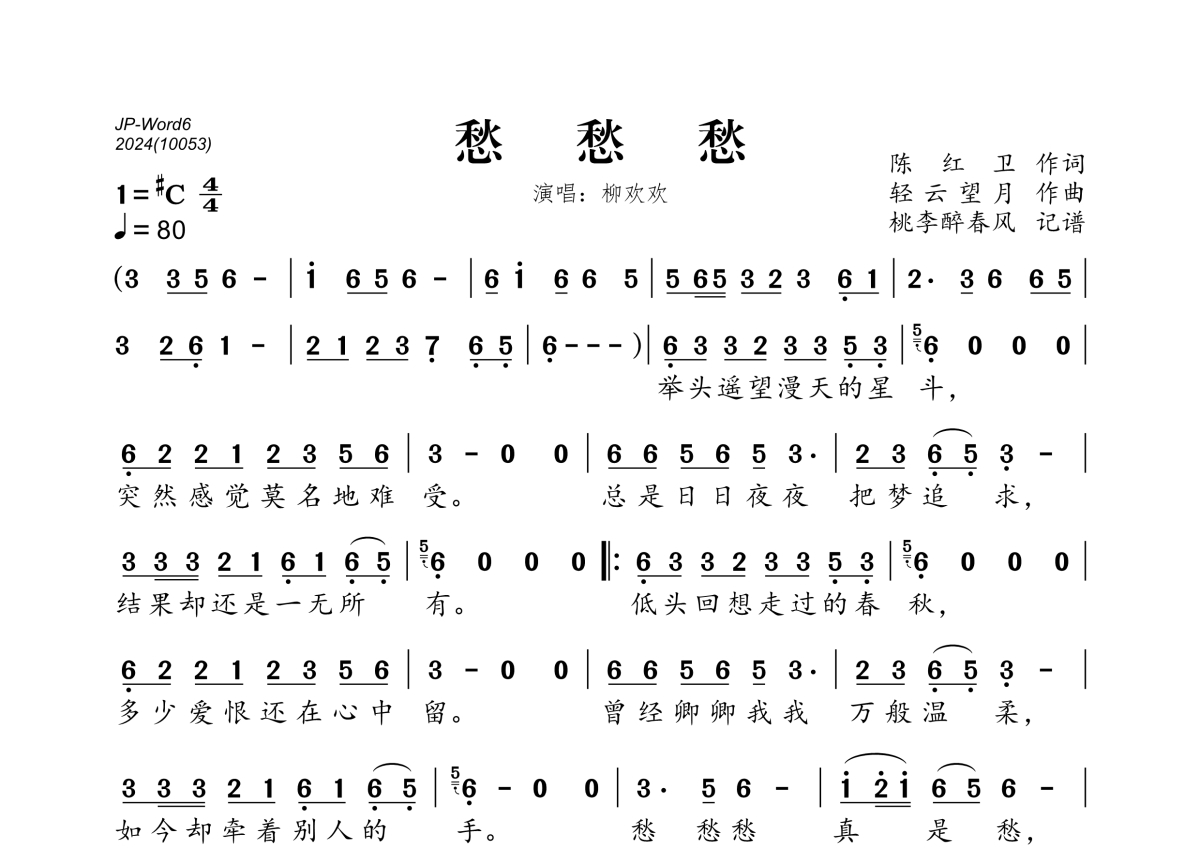 《愁愁愁》是柳欢欢演唱的一首歌曲,拍号为4/4拍,歌曲速度为每分钟80拍,这份简谱共有一张高清图谱,图谱由 @桃李醉春风 编配上传。