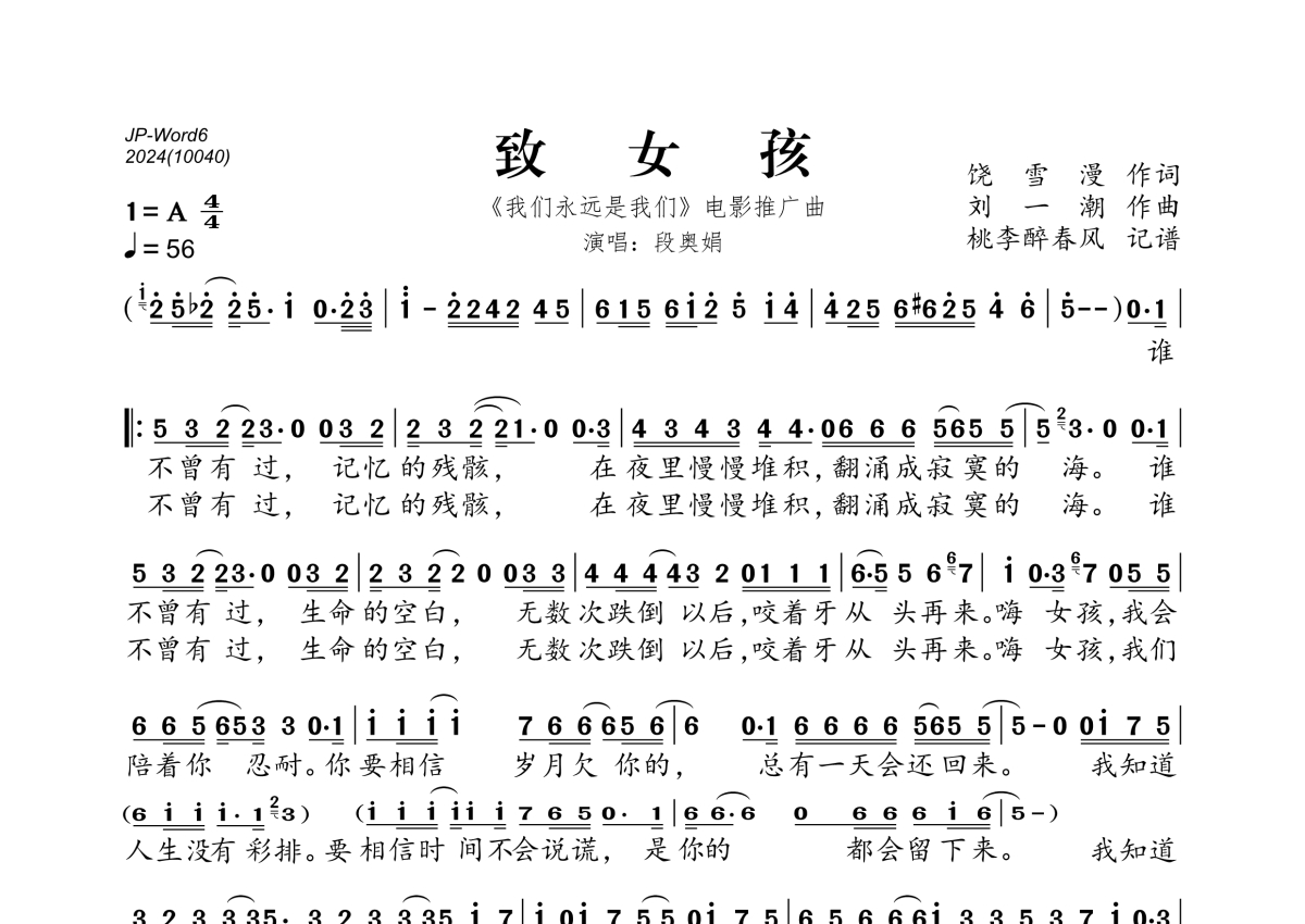 《致女孩》是段奥娟演唱的一首歌曲,拍号为4/4拍,歌曲速度为每分钟56拍,这份简谱共有一张高清图谱,图谱由 @桃李醉春风 编配上传。