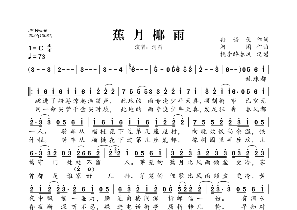 《蕉月椰雨》是河图演唱的一首歌曲,拍号为4/4拍,歌曲速度为每分钟73拍,这份简谱共有一张高清图谱,图谱由 @桃李醉春风 编配上传。