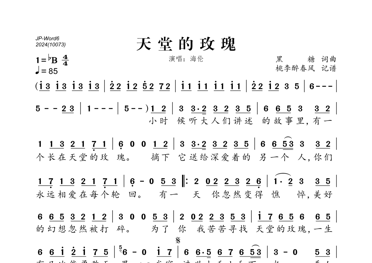 《天堂的玫瑰》是海伦演唱的一首歌曲,拍号为4/4拍,歌曲速度为每分钟85拍,这份简谱共有一张高清图谱,图谱由 @桃李醉春风 编配上传。