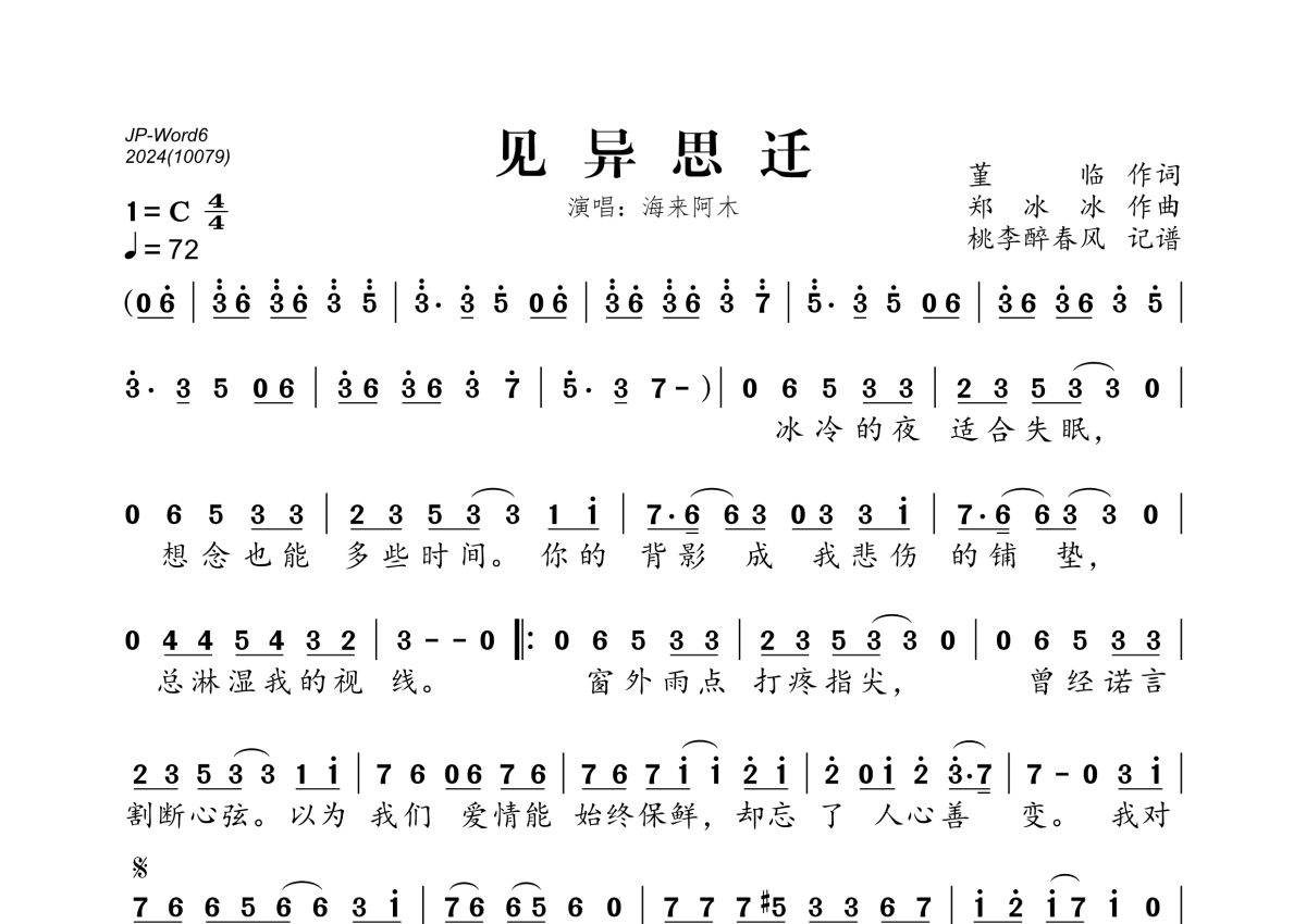 《见异思迁》是海来阿木演唱的一首歌曲,拍号为4/4拍,歌曲速度为每分钟72拍,这份简谱共有一张高清图谱,图谱由 @桃李醉春风 编配上传。