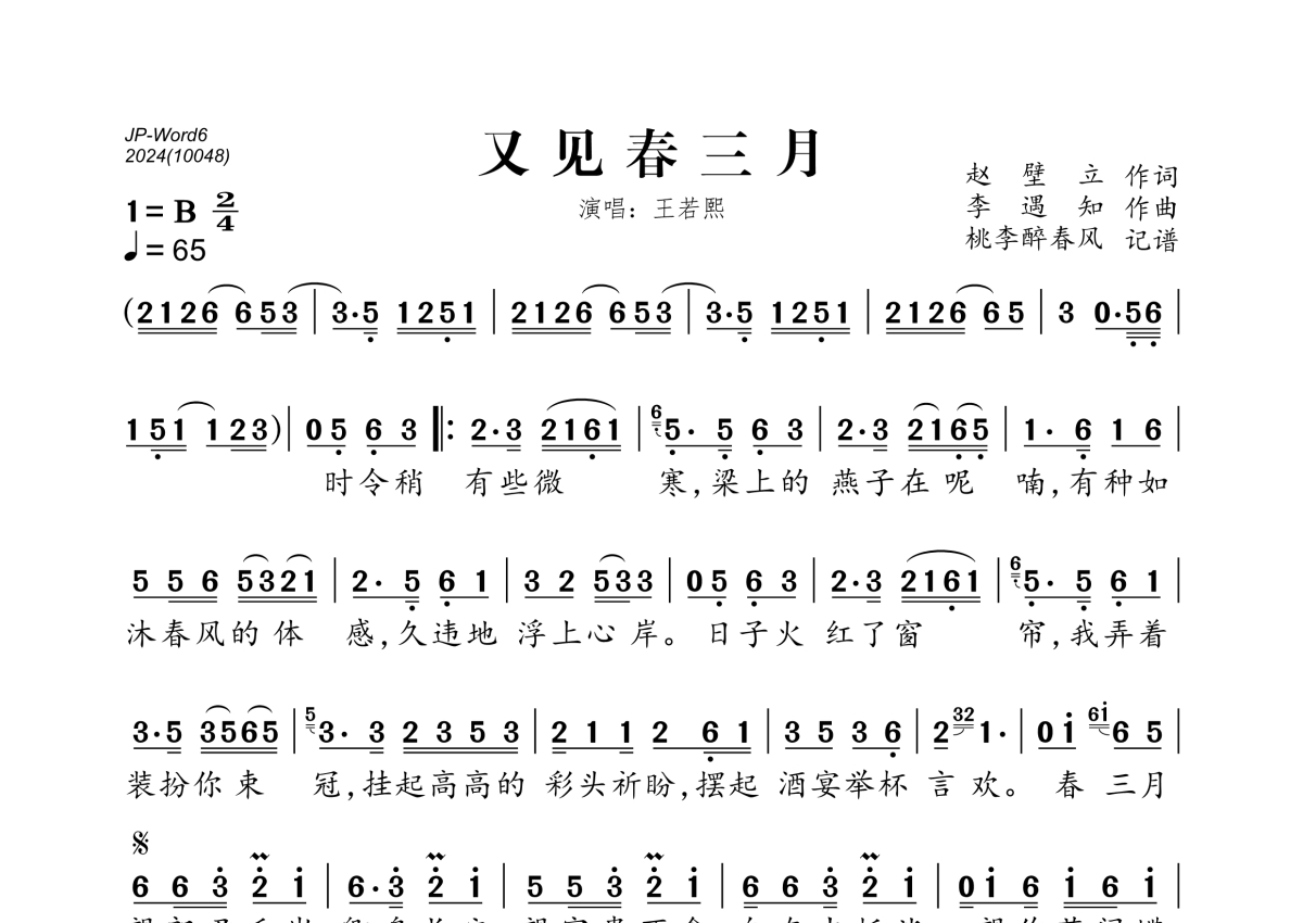《又见春三月》是王若熙演唱的一首歌曲,拍号为2/4拍,歌曲速度为每分钟65拍,这份简谱共有一张高清图谱,图谱由 @桃李醉春风 编配上传。