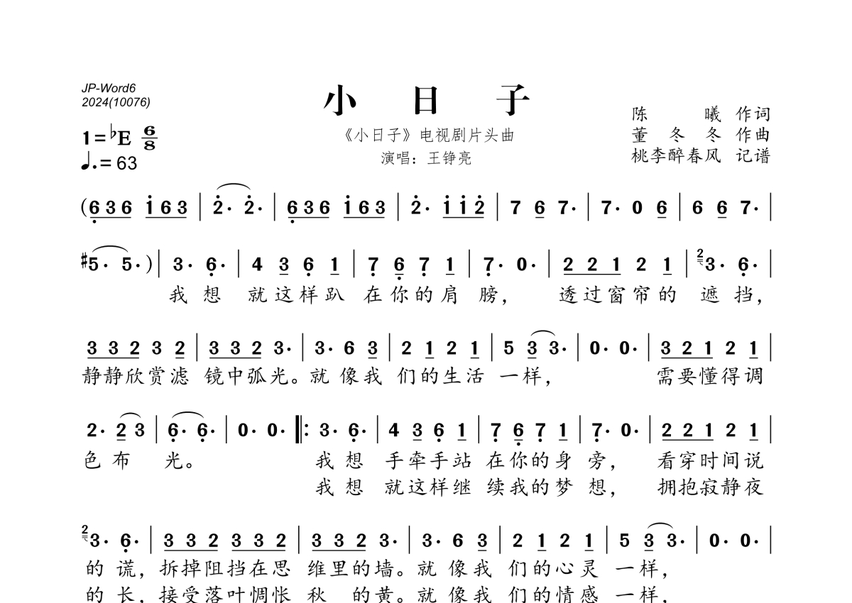 《小日子》是王铮亮演唱的一首歌曲,拍号为6/8拍,歌曲速度为每分钟63拍,这份简谱共有一张高清图谱,图谱由 @桃李醉春风 编配上传。
