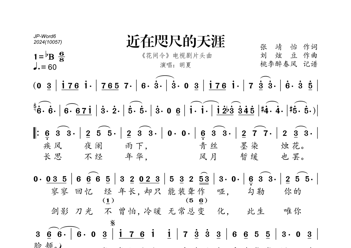 《近在咫尺的天涯》是胡夏演唱的一首歌曲,拍号为6/8拍,歌曲速度为每分钟60拍,这份简谱共有一张高清图谱,图谱由 @桃李醉春风 编配上传。