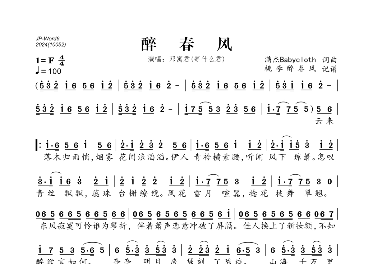 《醉春风》是邓寓君(等什么君)演唱的一首歌曲,拍号为4/4拍,歌曲速度为每分钟100拍,这份简谱共有一张高清图谱,图谱由 @桃李醉春风 编配上传。