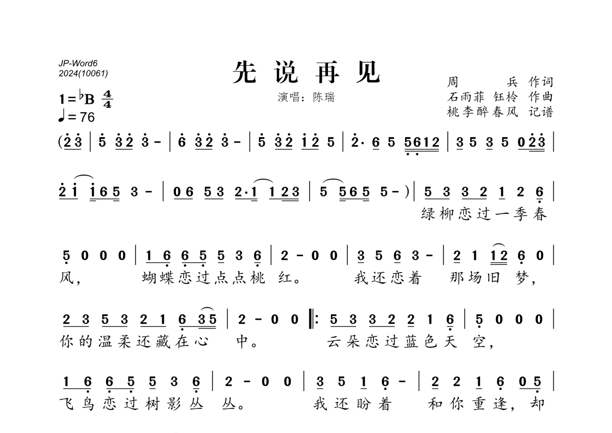 《先说再见》是陈瑞演唱的一首歌曲,拍号为4/4拍,歌曲速度为每分钟76拍,这份简谱共有一张高清图谱,图谱由 @桃李醉春风 编配上传。