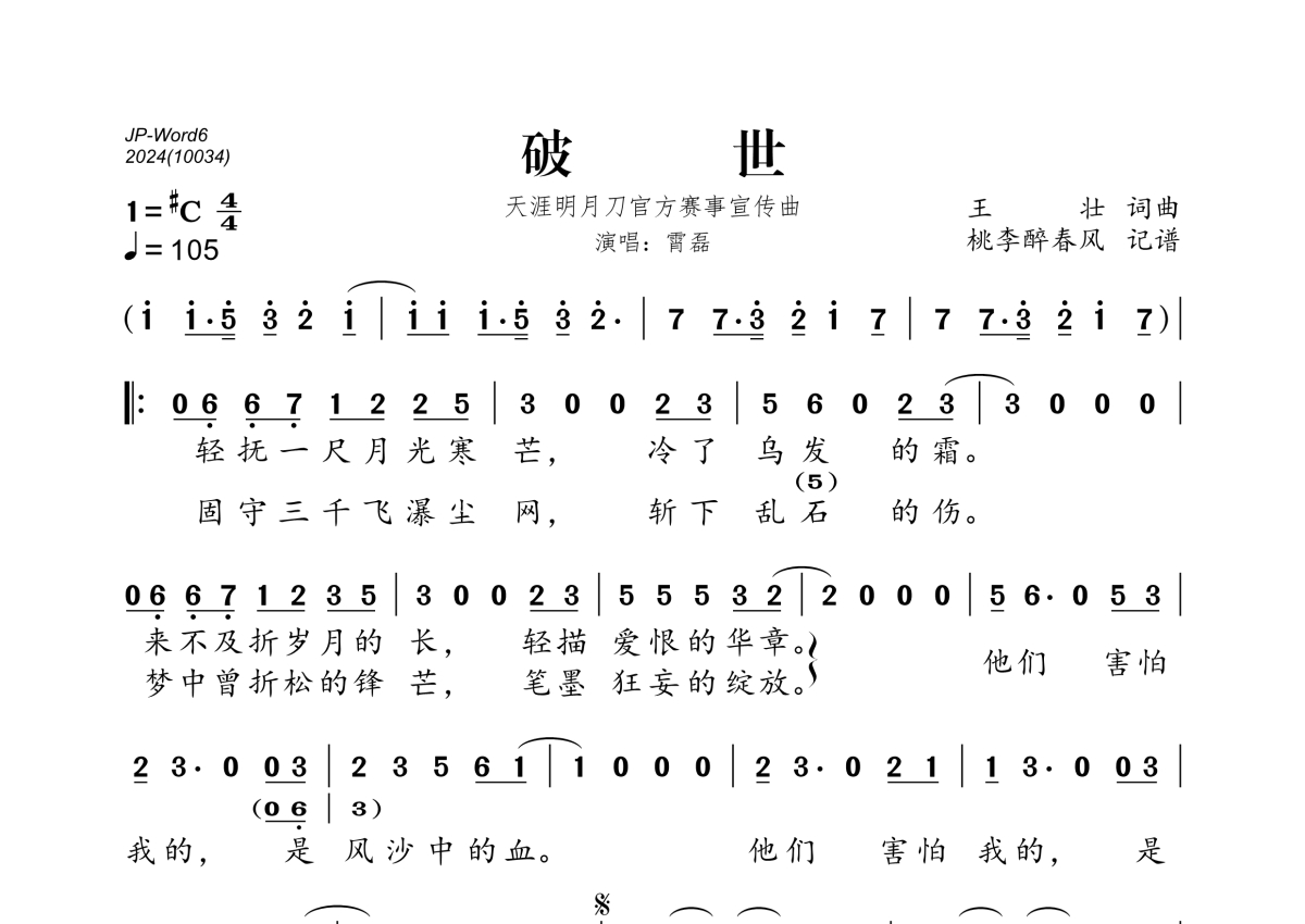 《破世》是霄磊演唱的一首歌曲,拍号为4/4拍,歌曲速度为每分钟105拍,这份简谱共有一张高清图谱,图谱由 @桃李醉春风 编配上传。