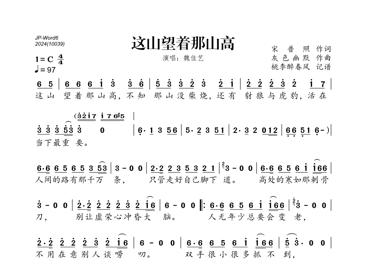 《这山望着那山高》是魏佳艺演唱的一首歌曲,拍号为4/4拍,歌曲速度为每分钟97拍,这份简谱共有一张高清图谱,图谱由 @桃李醉春风 编配上传。