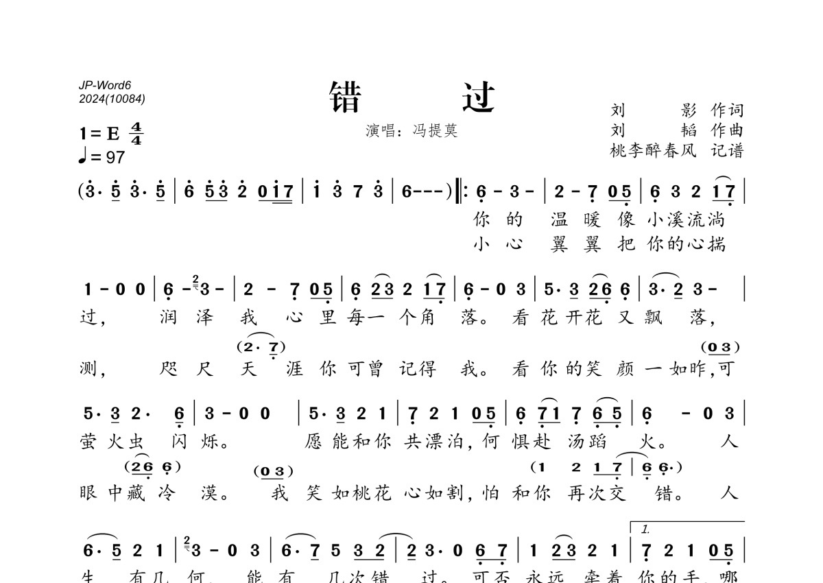 《错过》是冯提莫演唱的一首歌曲,拍号为4/4拍,歌曲速度为每分钟97拍,这份简谱共有一张高清图谱,图谱由 @桃李醉春风 编配上传。