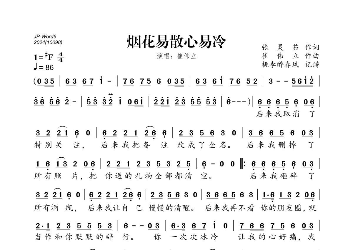 《烟花易散心易冷》是崔伟立演唱的一首歌曲,拍号为4/4拍,歌曲速度为每分钟86拍,这份简谱共有一张高清图谱,图谱由 @桃李醉春风 编配上传。