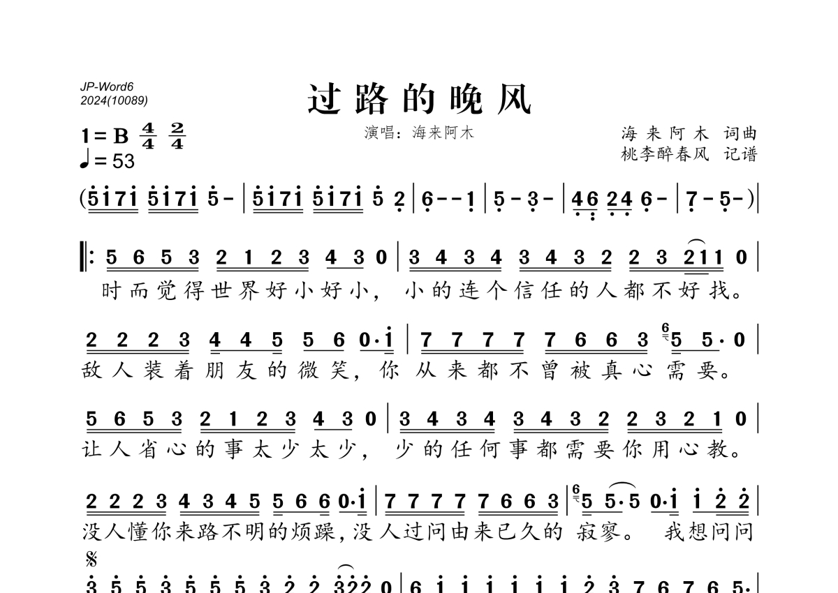 《过路的晚风》是海来阿木演唱的一首歌曲,拍号为4/4拍,歌曲速度为每分钟53拍,这份简谱共有一张高清图谱,图谱由 @桃李醉春风 编配上传。