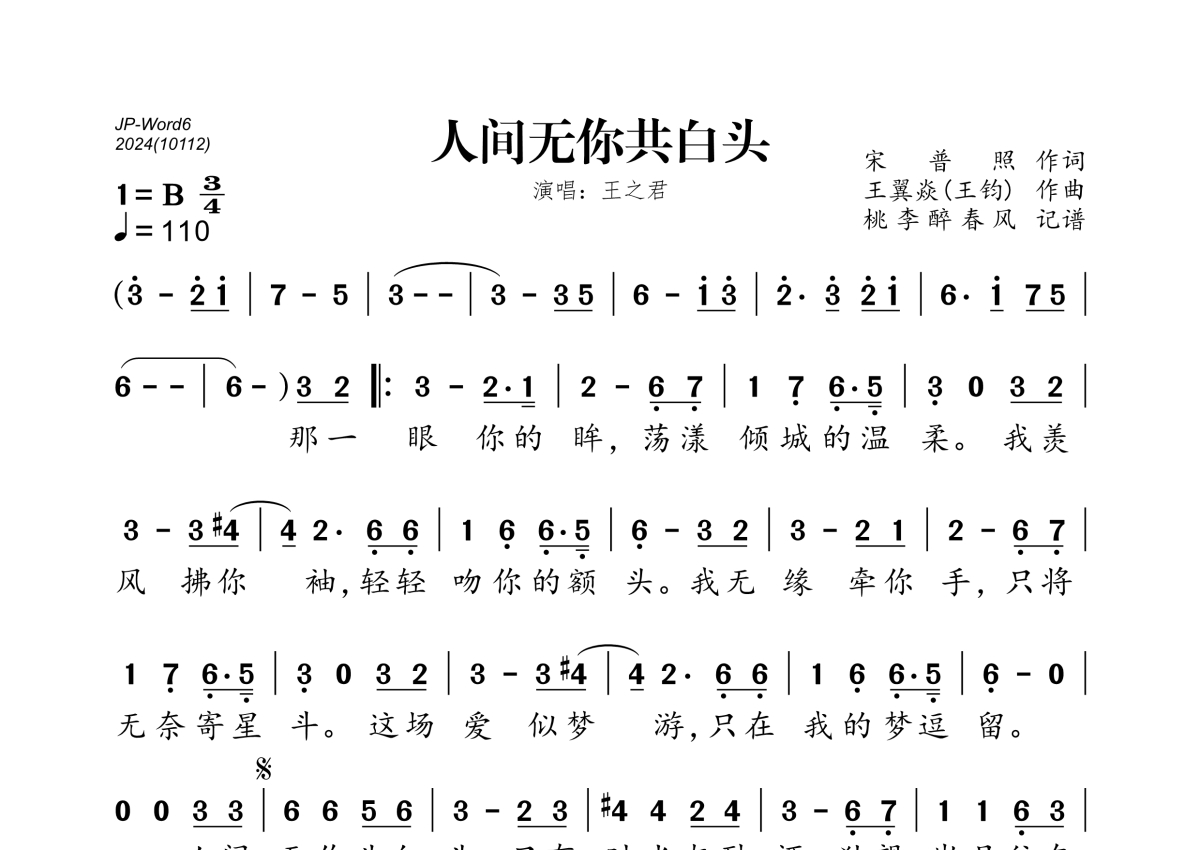 《人间无你共白头》是王之君演唱的一首歌曲,拍号为3/4拍,歌曲速度为每分钟110拍,这份简谱共有一张高清图谱,图谱由 @桃李醉春风 编配上传。