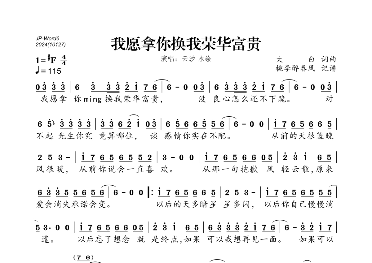 《我愿拿你换我荣华富贵》是云汐、水绘演唱的一首歌曲,拍号为4/4拍,歌曲速度为每分钟115拍,这份简谱共有一张高清图谱,图谱由 @桃李醉春风 编配上传。