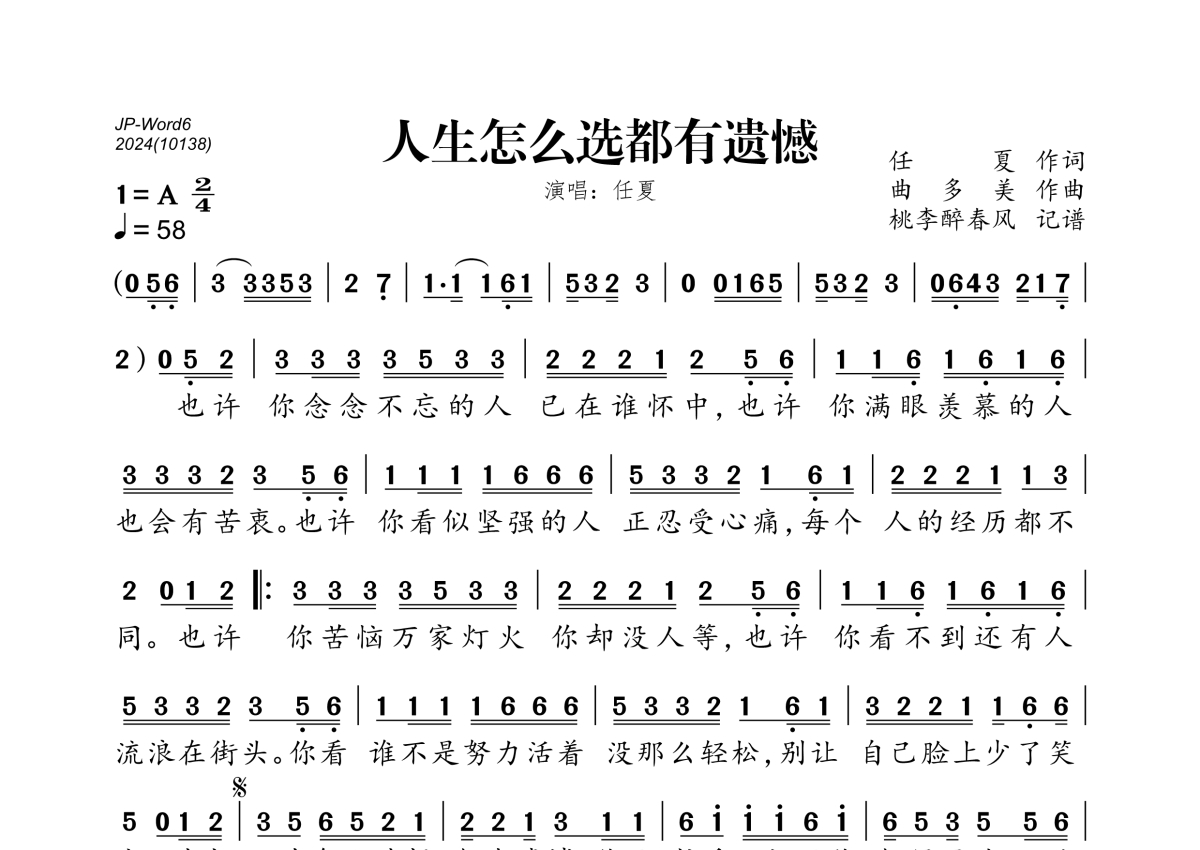 《人生怎么选都有遗憾》是任夏演唱的一首歌曲,拍号为2/4拍,歌曲速度为每分钟58拍,这份简谱共有一张高清图谱,图谱由 @桃李醉春风 编配上传。