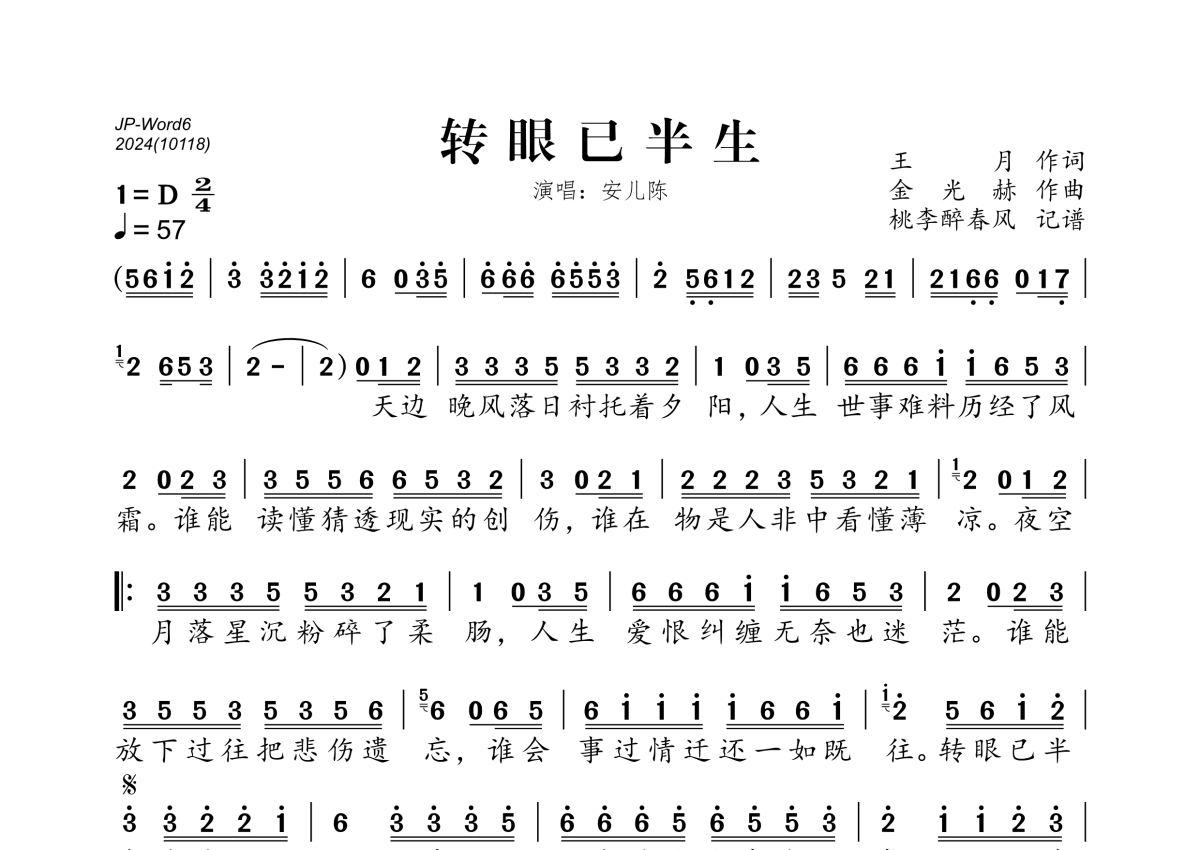 《转眼已半生》是安儿陈演唱的一首歌曲,拍号为2/4拍,歌曲速度为每分钟57拍,这份简谱共有一张高清图谱,图谱由 @桃李醉春风 编配上传。