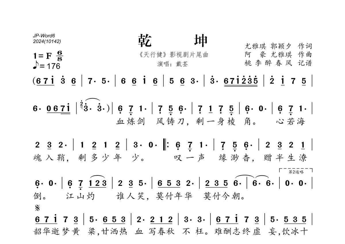 《乾坤》是戴荃演唱的一首歌曲,拍号为6/8拍,歌曲速度为每分钟176拍,这份简谱共有一张高清图谱,图谱由 @桃李醉春风 编配上传。