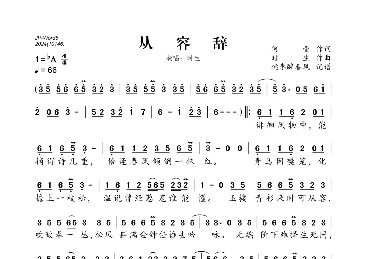 《从容辞》是叶生演唱的一首歌曲,拍号为4/4拍,歌曲速度为每分钟66拍,这份简谱共有一张高清图谱,图谱由 @桃李醉春风 编配上传。