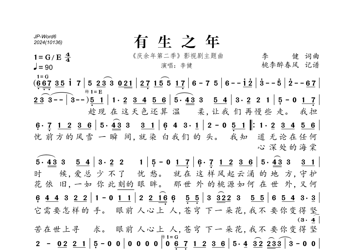 《有生之年》是李健演唱的一首歌曲,拍号为4/4拍,歌曲速度为每分钟90拍,这份简谱共有一张高清图谱,图谱由 @桃李醉春风 编配上传。