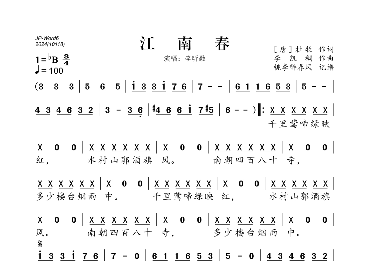 《江南春》是李昕融演唱的一首歌曲,拍号为3/4拍,歌曲速度为每分钟100拍,这份简谱共有一张高清图谱,图谱由 @桃李醉春风 编配上传。