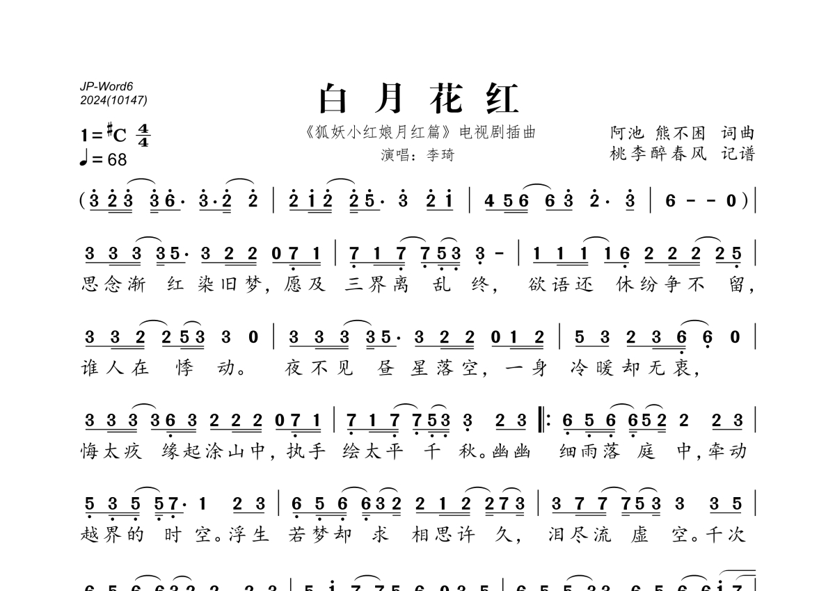 《白月花红》是李琦演唱的一首歌曲,拍号为4/4拍,歌曲速度为每分钟68拍,这份简谱共有一张高清图谱,图谱由 @桃李醉春风 编配上传。
