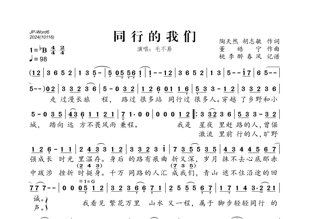 《同行的我们》是毛不易演唱的一首歌曲,拍号为4/4拍,歌曲速度为每分钟98拍,这份简谱共有一张高清图谱,图谱由 @桃李醉春风 编配上传。