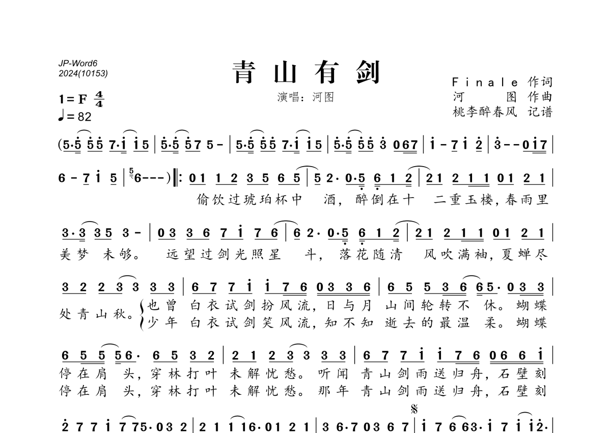 《青山有剑》是河图演唱的一首歌曲,拍号为4/4拍,歌曲速度为每分钟82拍,这份简谱共有一张高清图谱,图谱由 @桃李醉春风 编配上传。