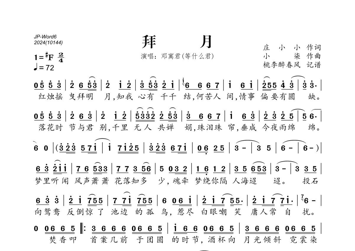 《拜月》是邓寓君(等什么君)演唱的一首歌曲,拍号为2/4拍,歌曲速度为每分钟72拍,这份简谱共有一张高清图谱,图谱由 @桃李醉春风 编配上传。