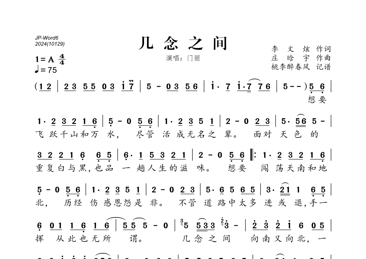 《几念之间》是门丽演唱的一首歌曲,拍号为4/4拍,歌曲速度为每分钟75拍,这份简谱共有一张高清图谱,图谱由 @桃李醉春风 编配上传。
