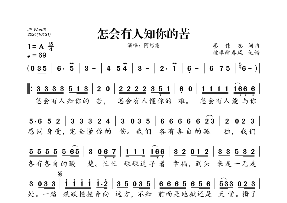 《怎会有人知你的苦》是阿悠悠演唱的一首歌曲,拍号为2/4拍,歌曲速度为每分钟69拍,这份简谱共有一张高清图谱,图谱由 @桃李醉春风 编配上传。