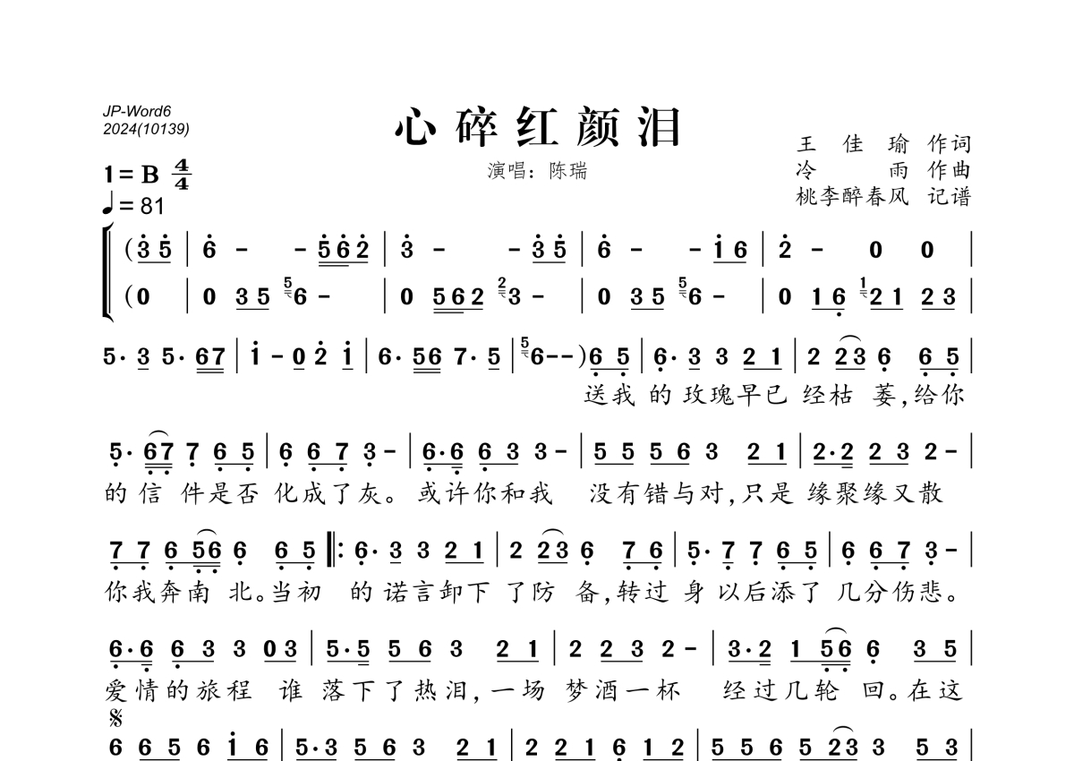 《心碎红颜泪》是陈瑞演唱的一首歌曲,拍号为4/4拍,歌曲速度为每分钟81拍,这份简谱共有一张高清图谱,图谱由 @桃李醉春风 编配上传。