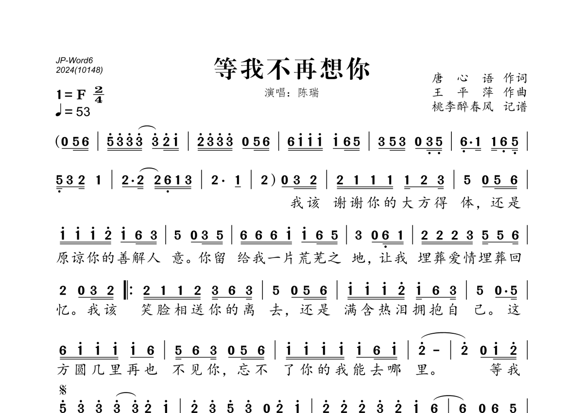《等我不再想你》是陈瑞演唱的一首歌曲,拍号为2/4拍,歌曲速度为每分钟53拍,这份简谱共有一张高清图谱,图谱由 @桃李醉春风 编配上传。
