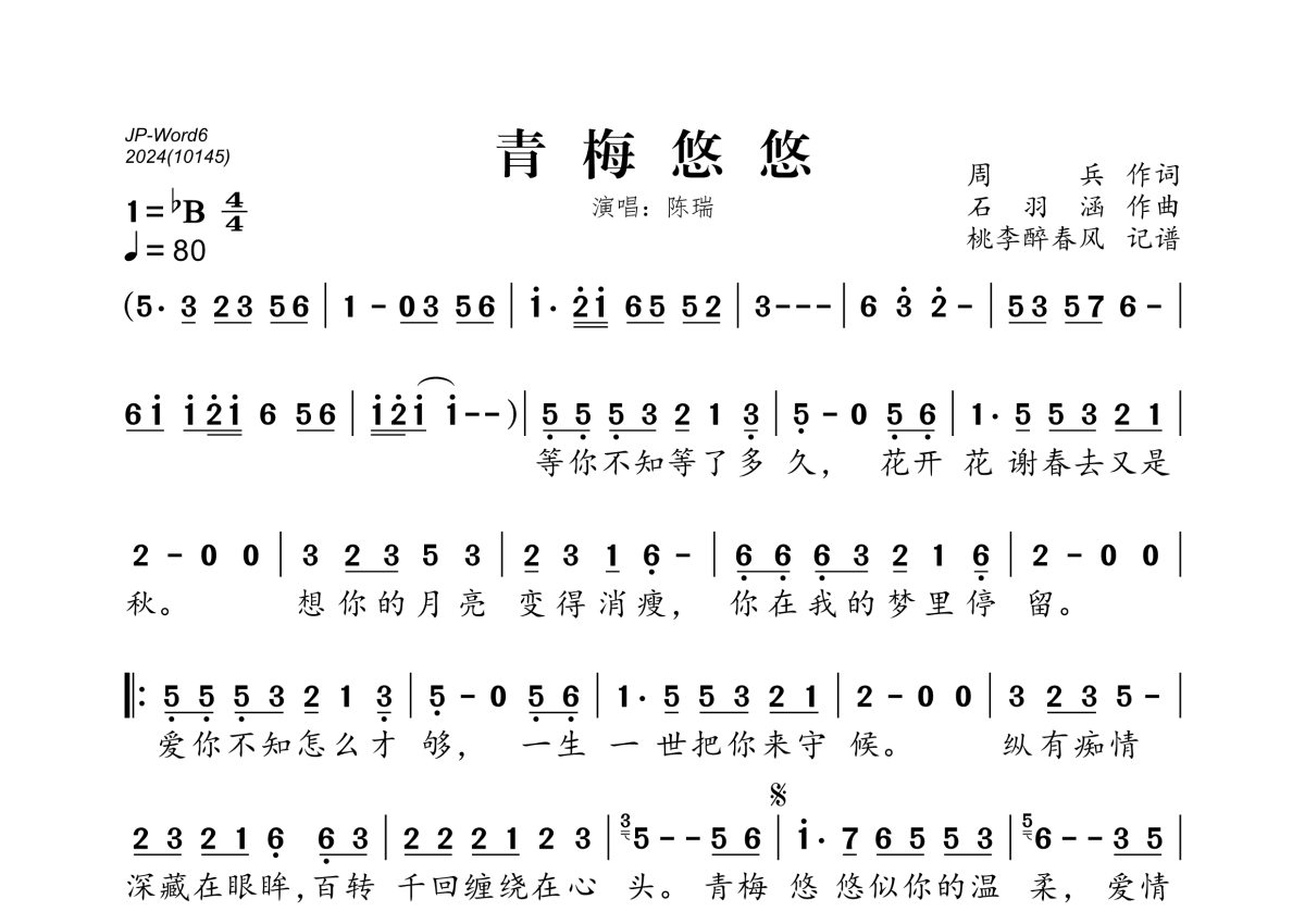 青梅悠悠简谱 - 陈瑞