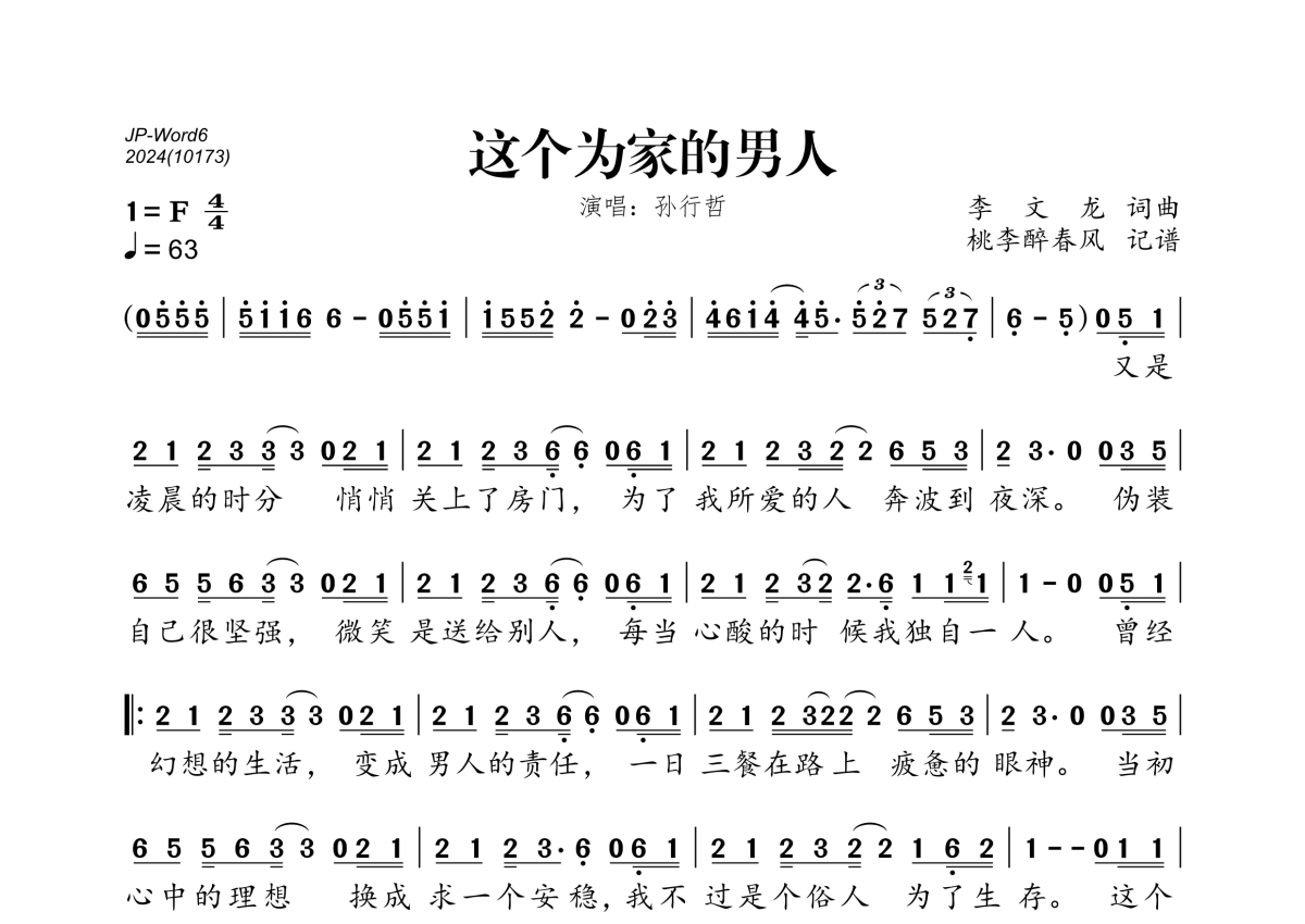 《这个为家的男人》是孙行哲演唱的一首歌曲,拍号为4/4拍,歌曲速度为每分钟63拍,这份简谱共有一张高清图谱,图谱由 @桃李醉春风 编配上传。
