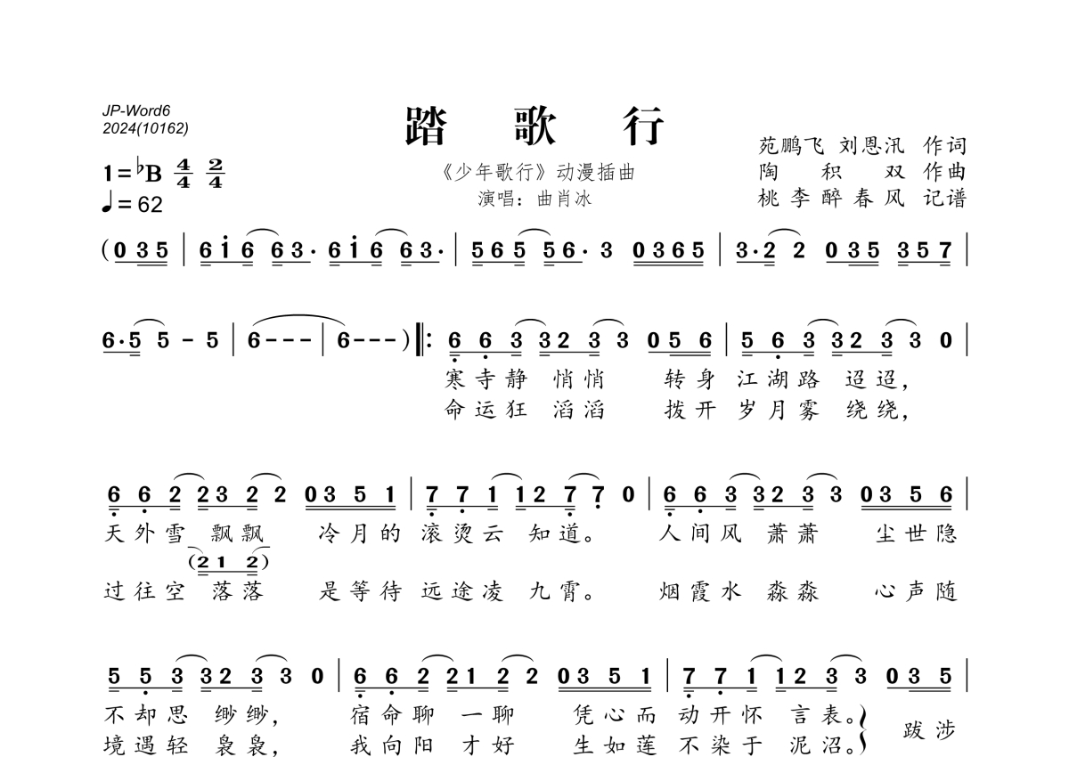 《踏歌行》是曲肖冰演唱的一首歌曲,拍号为4/4拍,歌曲速度为每分钟62拍,这份简谱共有一张高清图谱,图谱由 @桃李醉春风 编配上传。