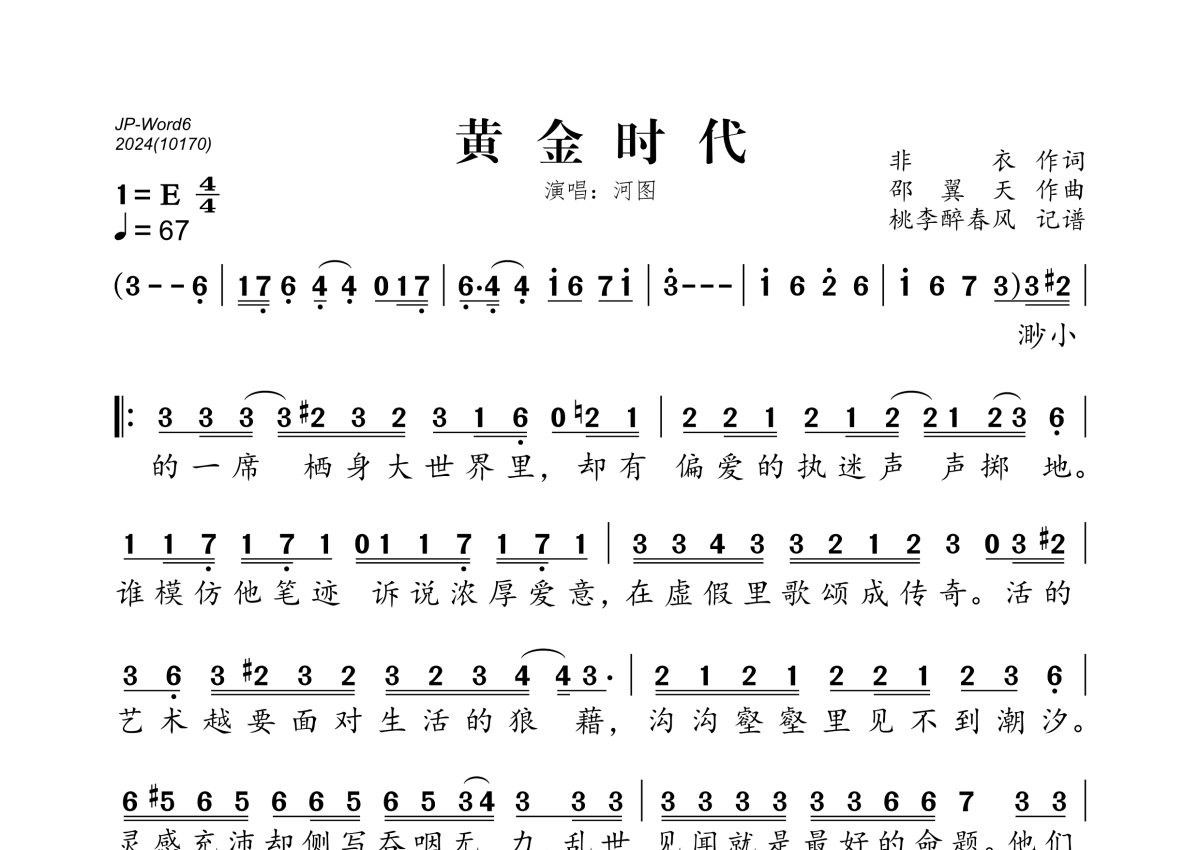 《黄金时代》是洋澜一演唱的一首歌曲,拍号为4/4拍,歌曲速度为每分钟67拍,这份简谱共有一张高清图谱,图谱由 @桃李醉春风 编配上传。