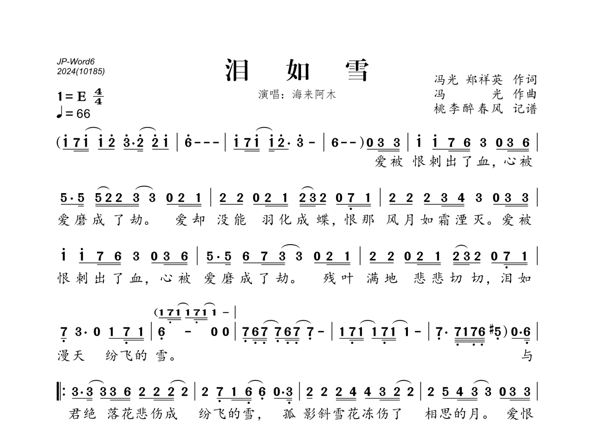 《泪如雪》是海来阿木演唱的一首歌曲,拍号为4/4拍,歌曲速度为每分钟66拍,这份简谱共有一张高清图谱,图谱由 @桃李醉春风 编配上传。