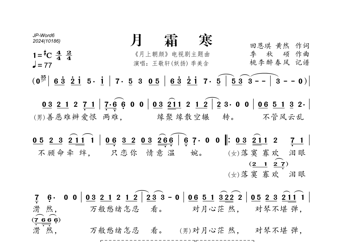 《月霜寒》是王敬轩(妖扬)、季美含演唱的一首歌曲,拍号为4/4拍,歌曲速度为每分钟77拍,这份简谱共有两张高清图谱,图谱由 @桃李醉春风 编配上传。