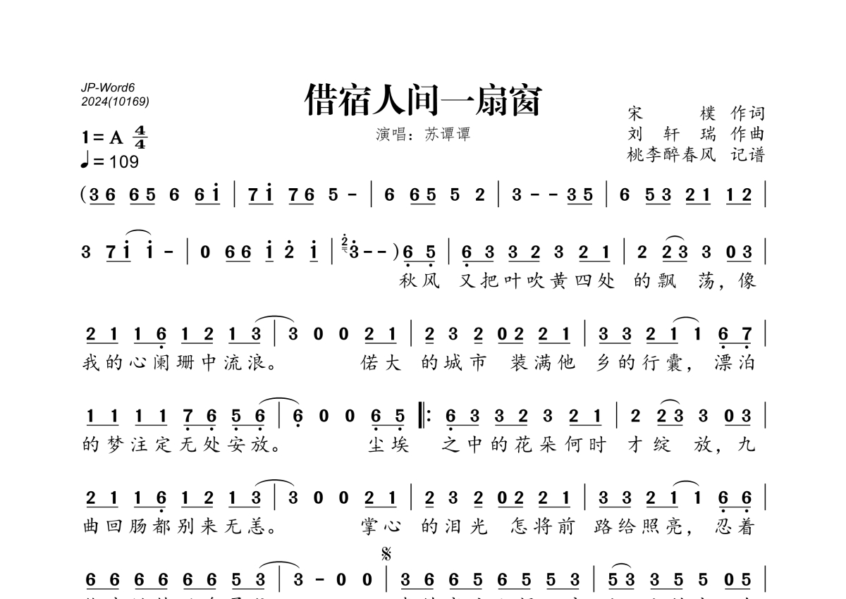 《借宿人间一扇窗》是苏谭谭演唱的一首歌曲,拍号为4/4拍,歌曲速度为每分钟109拍,这份简谱共有一张高清图谱,图谱由 @桃李醉春风 编配上传。