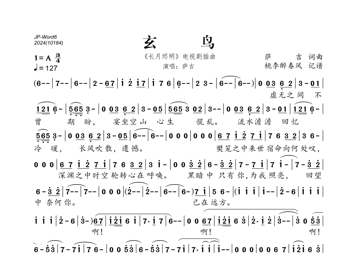 《玄鸟》是萨吉演唱的一首歌曲,拍号为3/4拍,歌曲速度为每分钟127拍,这份简谱共有一张高清图谱,图谱由 @桃李醉春风 编配上传。