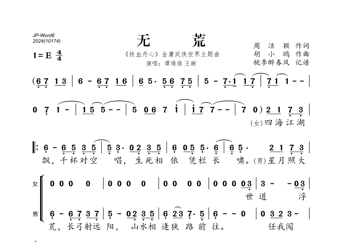 《无荒》是谭维维、王晰演唱的一首歌曲,拍号为4/4拍,这份简谱共有两张高清图谱,图谱由 @桃李醉春风 编配上传。