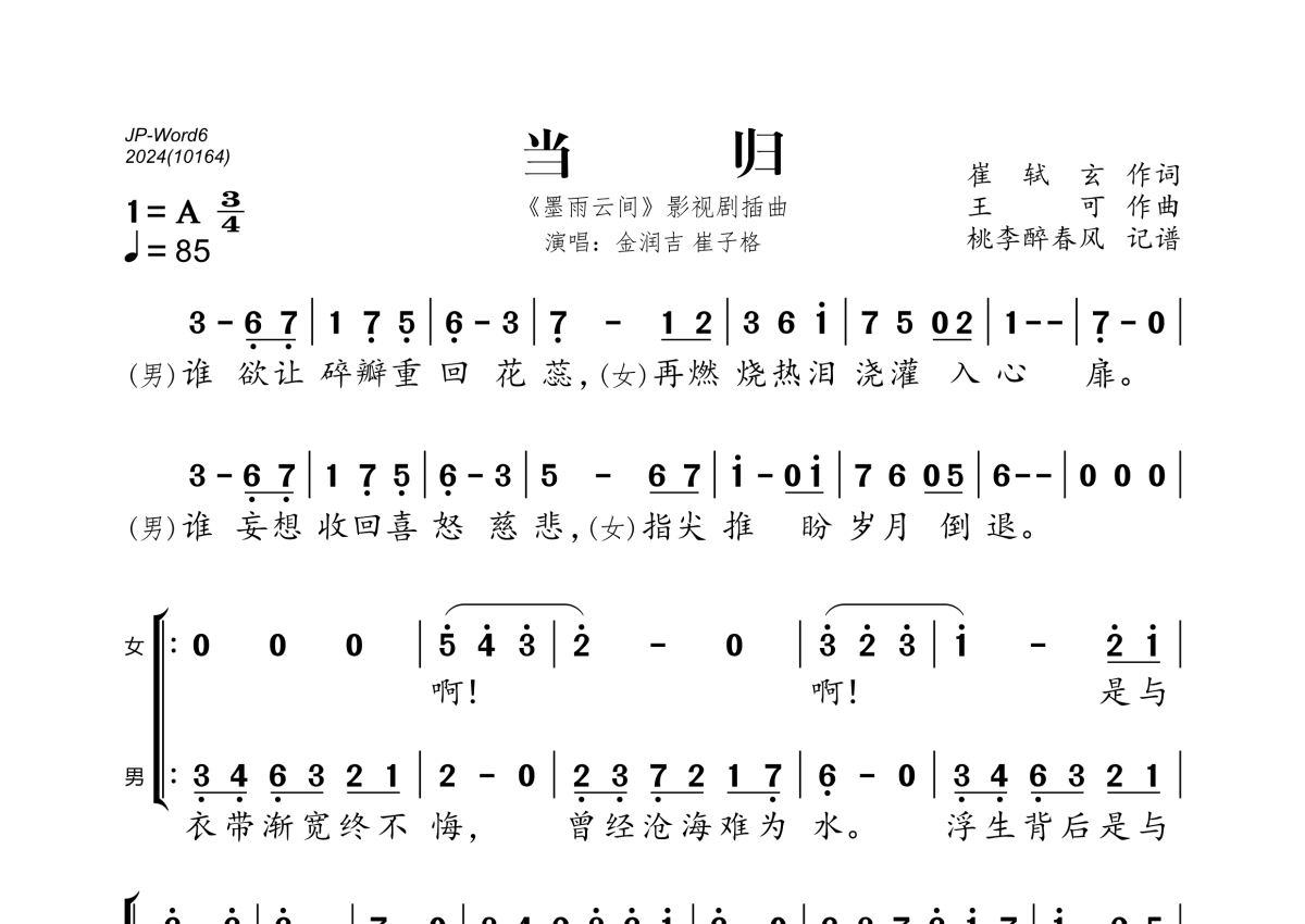 《当归》是金润吉、崔子格演唱的一首歌曲,拍号为3/4拍,歌曲速度为每分钟85拍,这份简谱共有两张高清图谱,图谱由 @桃李醉春风 编配上传。
