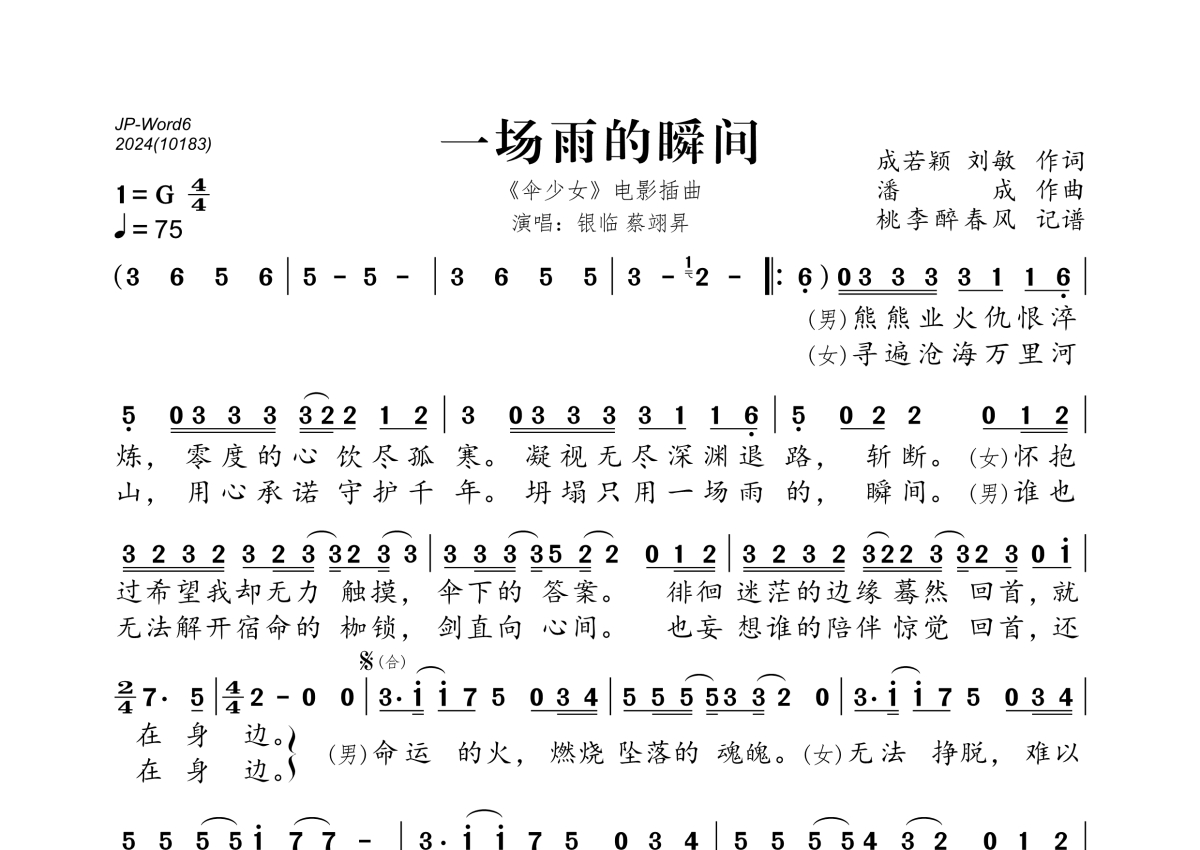 《一场雨的瞬间》是银临、蔡翊昇演唱的一首歌曲,拍号为4/4拍,歌曲速度为每分钟75拍,这份简谱共有一张高清图谱,图谱由 @桃李醉春风 编配上传。