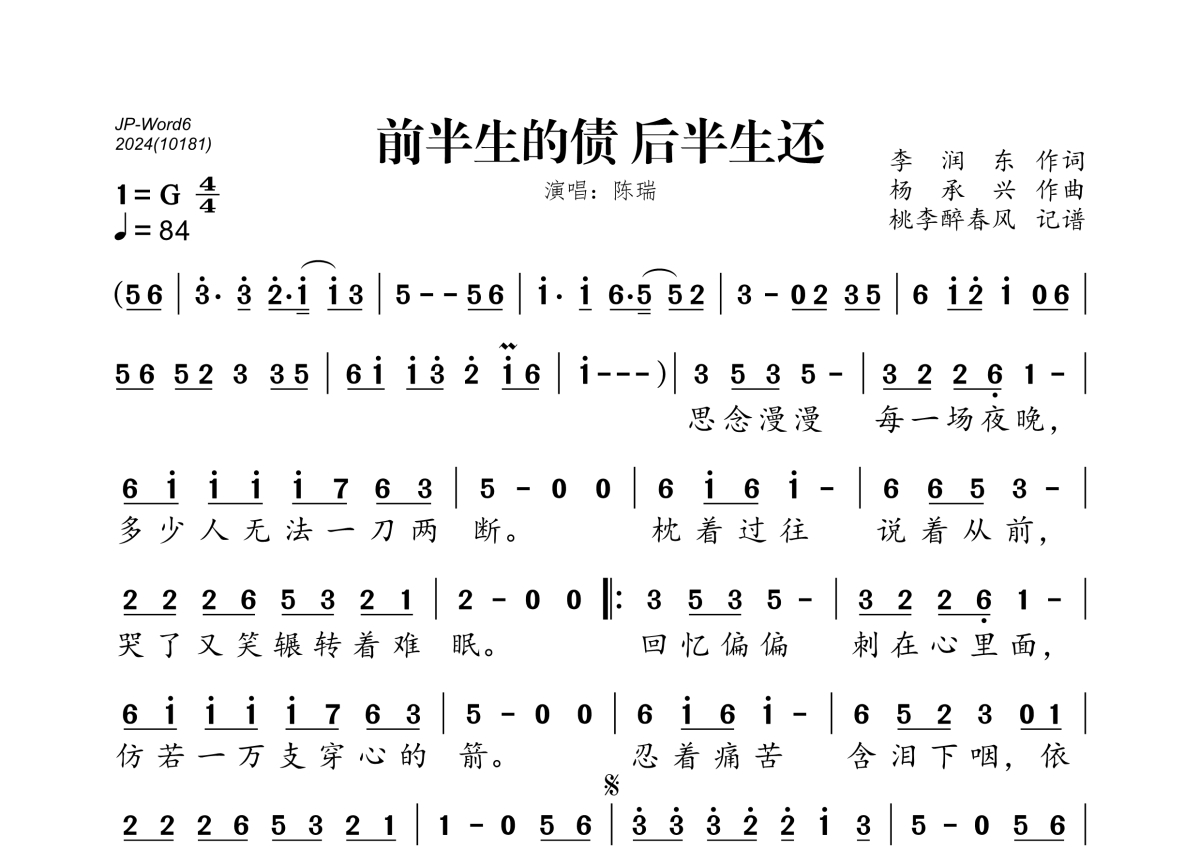 《前半生的债 后半生还》是陈瑞演唱的一首歌曲,拍号为4/4拍,歌曲速度为每分钟84拍,这份简谱共有一张高清图谱,图谱由 @桃李醉春风 编配上传。