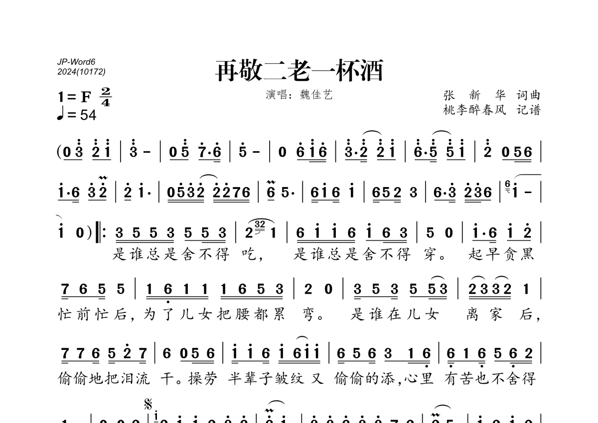 《再敬二老一杯酒》是魏佳艺演唱的一首歌曲,拍号为2/4拍,歌曲速度为每分钟54拍,这份简谱共有一张高清图谱,图谱由 @桃李醉春风 编配上传。