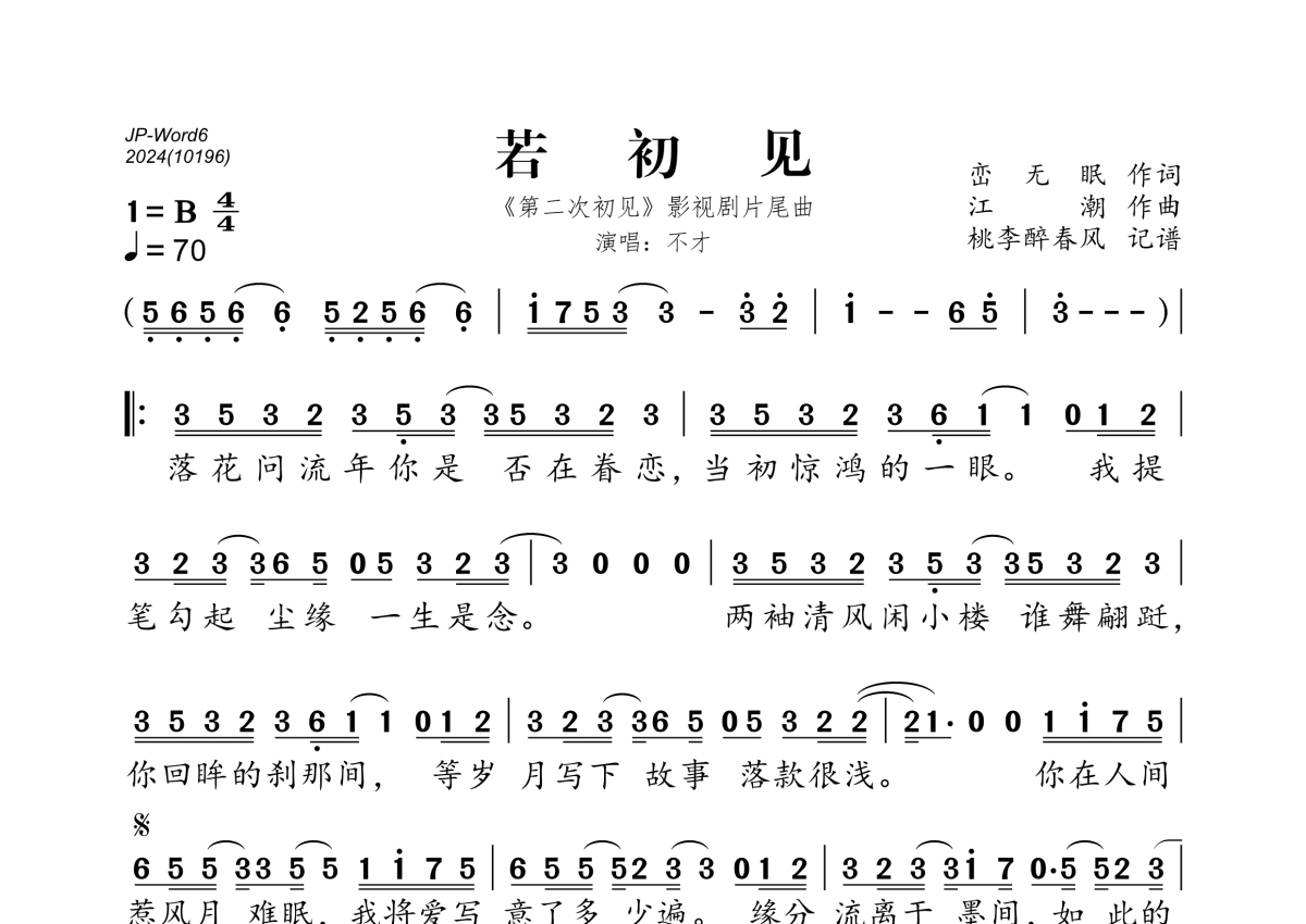 《若初见》是不才演唱的一首歌曲,拍号为4/4拍,歌曲速度为每分钟70拍,这份简谱共有一张高清图谱,图谱由 @桃李醉春风 编配上传。