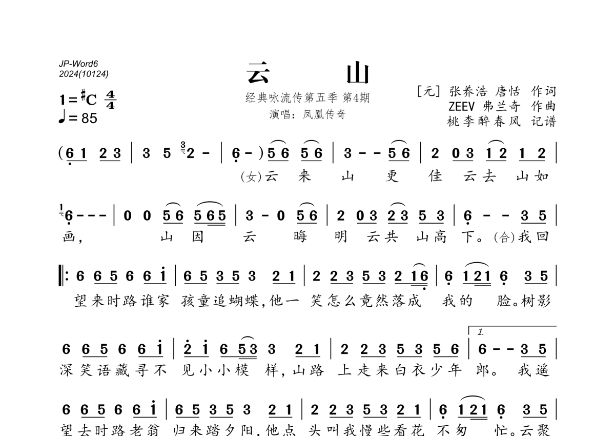 《云山》是凤凰传奇演唱的一首歌曲,拍号为4/4拍,歌曲速度为每分钟85拍,这份简谱共有两张高清图谱,图谱由 @桃李醉春风 编配上传。