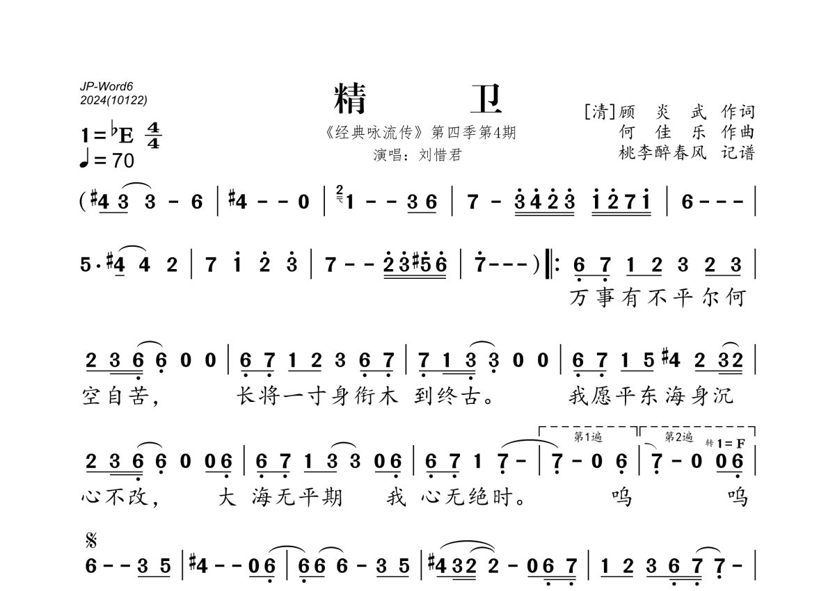《精卫》是刘惜君演唱的一首歌曲,拍号为4/4拍,歌曲速度为每分钟70拍,这份简谱共有一张高清图谱,图谱由 @桃李醉春风 编配上传。
