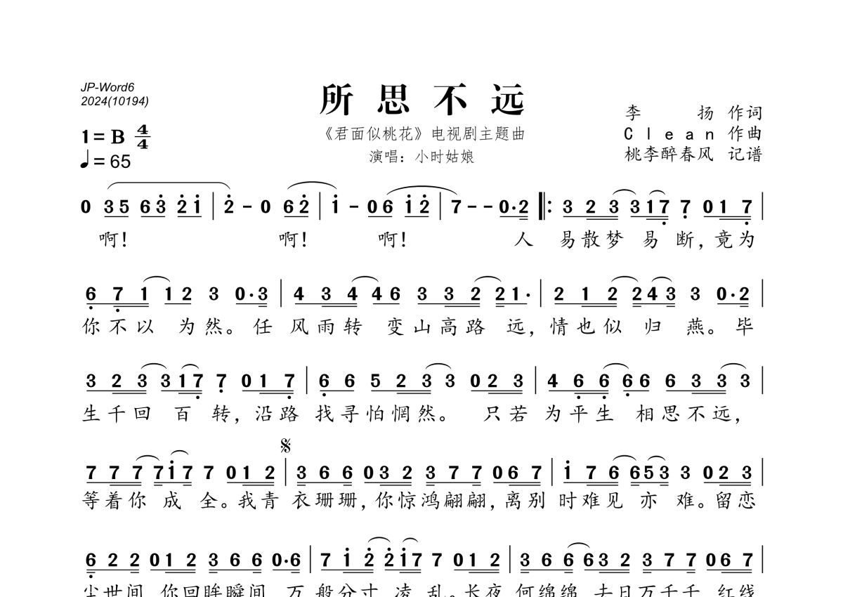《所思不远》是小叶姑娘演唱的一首歌曲,拍号为4/4拍,歌曲速度为每分钟65拍,这份简谱共有一张高清图谱,图谱由 @桃李醉春风 编配上传。