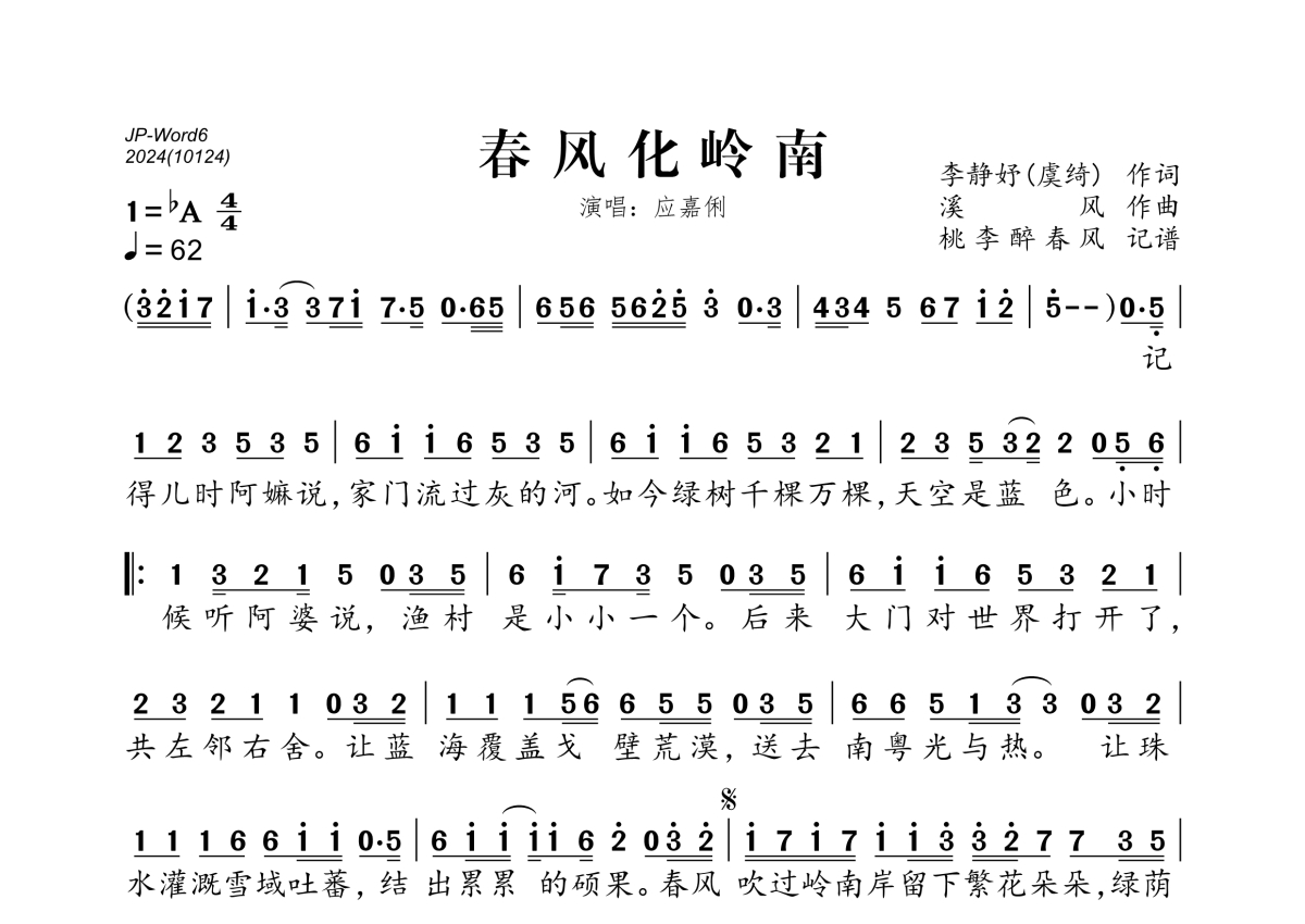 《春风化岭南》是应嘉俐演唱的一首歌曲,拍号为4/4拍,歌曲速度为每分钟62拍,这份简谱共有一张高清图谱,图谱由 @桃李醉春风 编配上传。
