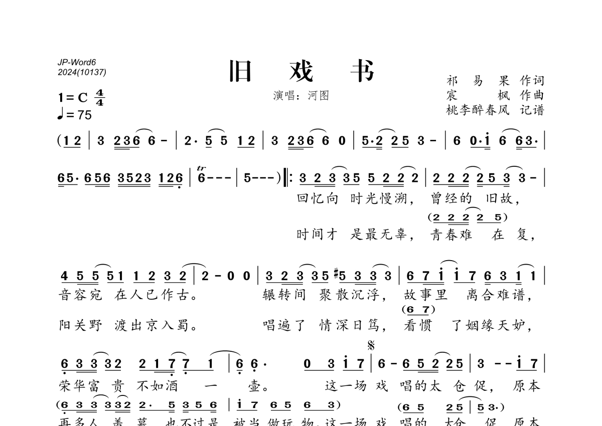 《旧戏书》是河图演唱的一首歌曲,拍号为4/4拍,歌曲速度为每分钟75拍,这份简谱共有一张高清图谱,图谱由 @桃李醉春风 编配上传。